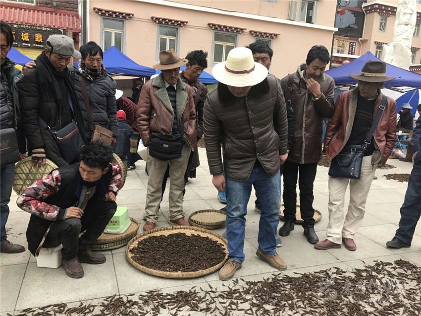 收購(gòu)商在理塘格薩爾廣場(chǎng)看蟲草。