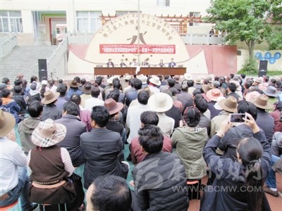 在雅江縣河口鎮(zhèn)希望小學(xué)的廣場上,來自全鎮(zhèn)各村的430名群眾齊集一堂,認(rèn)真聆聽宣講團成員其美貢布和劉美翁姆的宣講。