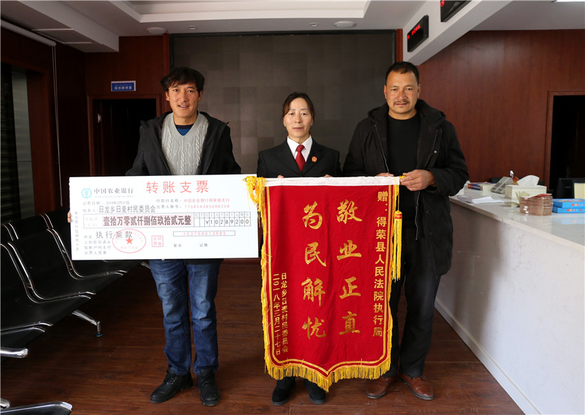 在執(zhí)行款發(fā)放現(xiàn)場,得榮法院執(zhí)行局局長小娜錯法官正逐一核對當(dāng)事人信息,辦理領(lǐng)款手續(xù),她向筆者介紹說:“去年開始,我們在共擬定出了29個基本解決執(zhí)行難的工作任務(wù),形成了7條具體措施,對所屬的11件執(zhí)行難案每件形成專項(xiàng)行動方案,并將‘一案一辦法’的基本原則落實(shí)到了后續(xù)的23件案件執(zhí)行當(dāng)中,取得了良好的執(zhí)行效果,今后我們將持續(xù)深入執(zhí)行難專項(xiàng)行動,全面深入落實(shí)依法治理,切實(shí)保護(hù)人民群眾的合法權(quán)益,努力讓人民群眾在每一件司法案件中都感受到公平正義,感受到更多的幸福感和安全感。”